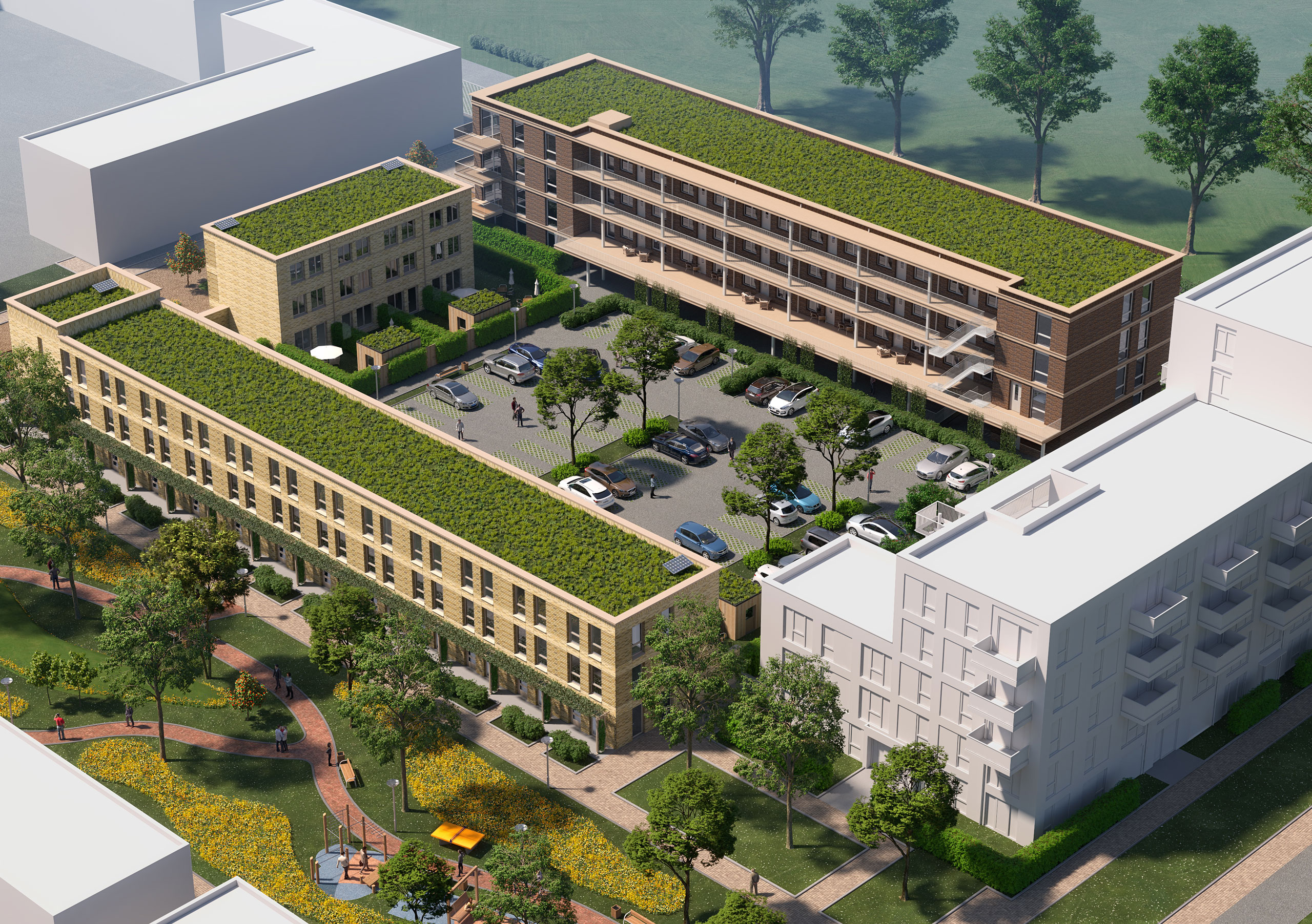 This overview image highlights the project’s central green space and brick-clad architecture. It provides a clear understanding of the site layout and atmosphere — ideal for brochures, websites, and buyer presentations.